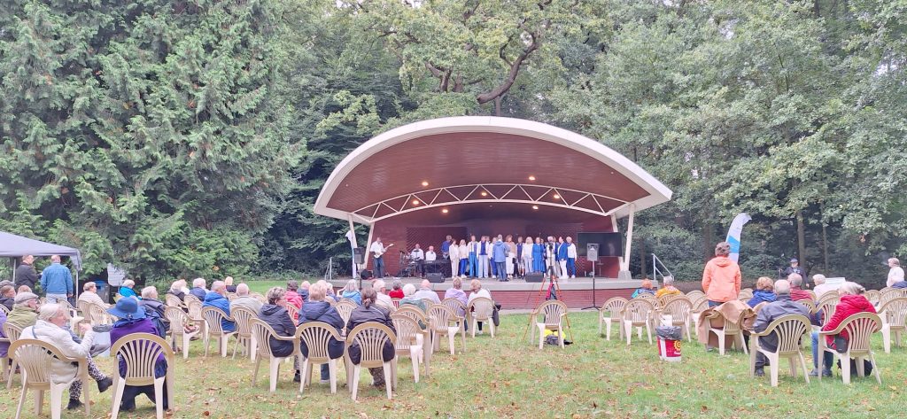 Zo’n 15 nummers bracht het koor ten gehore, uit de periode jaren ’60 tot heden. Het enthousiasme was aanstekelijk, de bezoekers zongen met verschillende nummers mee en de sfeer kwam er goed in. De middag werd goed bezocht, ondanks een enkel buitje. Al met al een heel geslaagd optreden in het mooie park en zeker voor herhaling vatbaar.